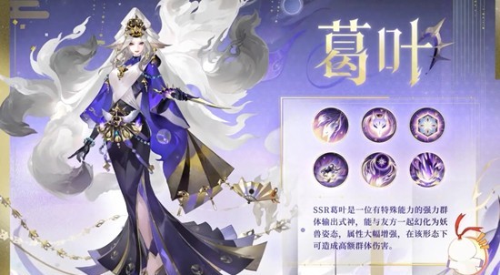 SSR葛叶:群体输出式神,能与友方一起幻化为妖兽姿态,属性增强