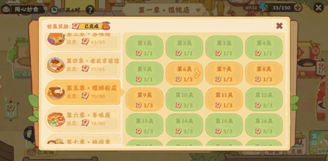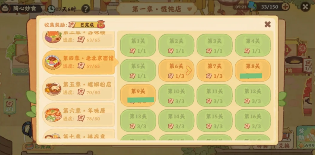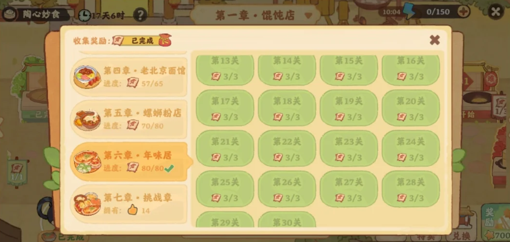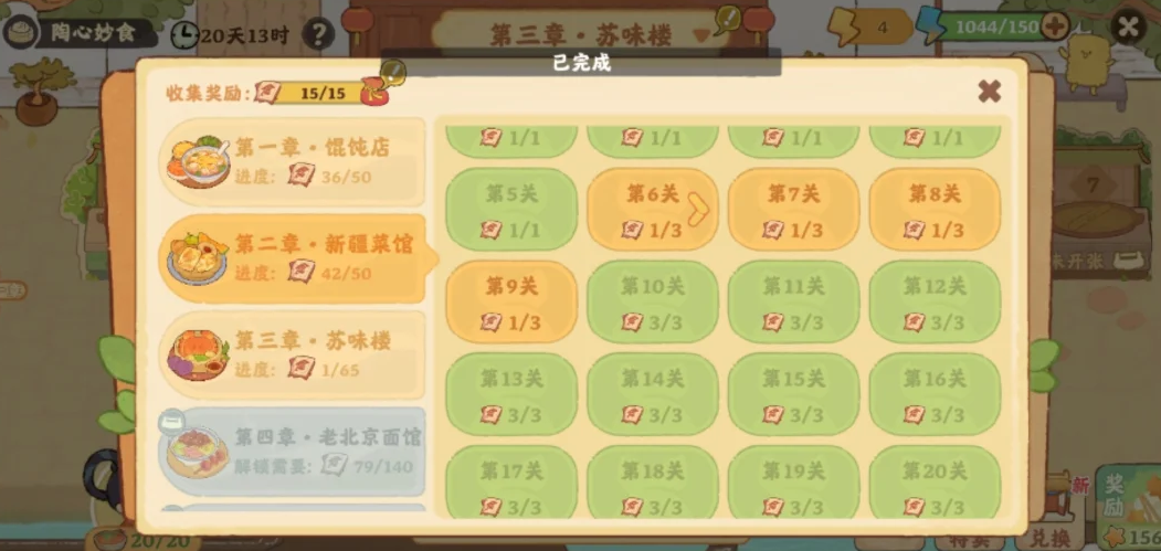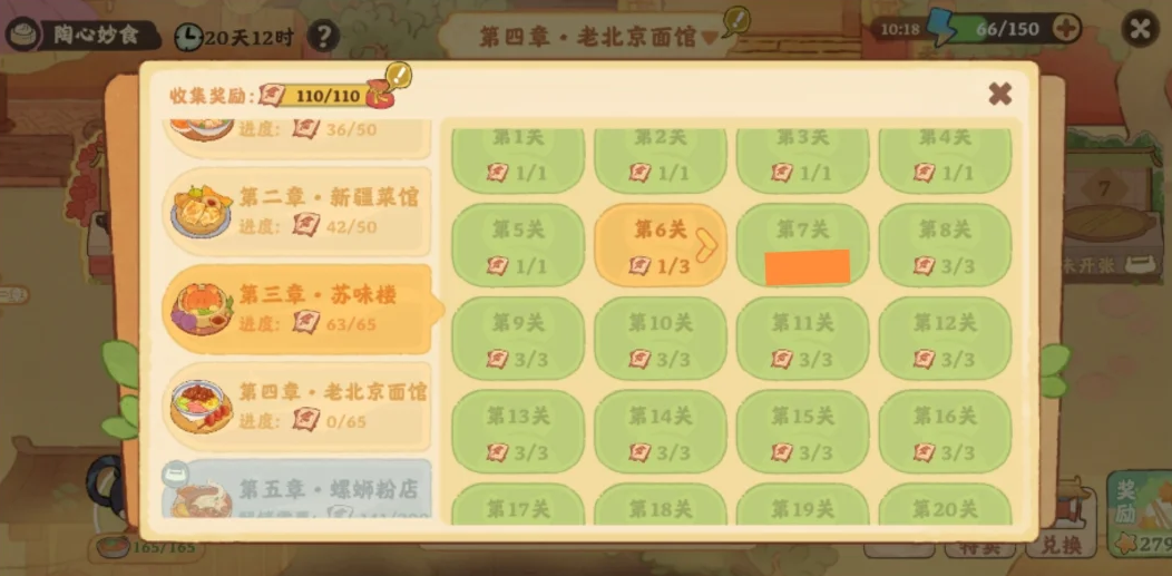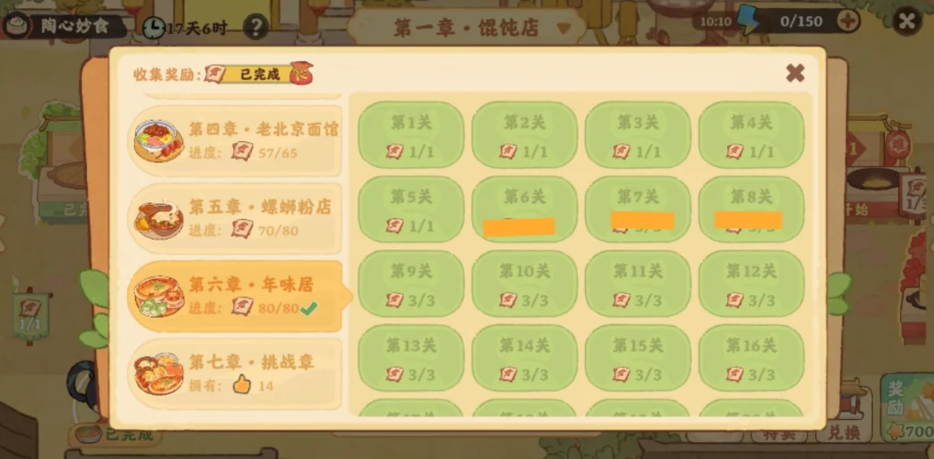 桃源深处有人家陶心妙食活动中,首先从从第6关开始,每个关卡可以玩两次,普通模式+困难模式,橙色表示只通关普通模式,绿色表示普通和困难都通关了。总共空20关,空的关卡只通关一下,剩下的其它关卡都通关两次,详细具体空的关卡详情内容见以下正文!