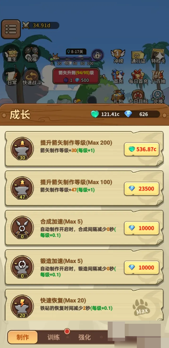 游戏初期,弓箭通过铁砧系统手工打造,基础版本虽伤害有限,但足以支撑前期推图节奏。进入中期后,原始弓箭性能明显滞后,此时必须启动双轨强化机制:其一为钻石强化路线,每次升级可显著提升基础攻击力与附加属性;其二为升阶机制,需消耗两把同阶弓箭合成更高品质装备,升阶后不仅基础数值跃升,还将解锁额外词条与特效加成,是中后期战力突破的核心手段。