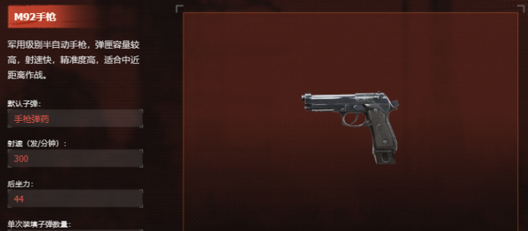 该型号为半自动手枪,标配弹匣容量达15发,射速稳定,支持连续点射。其紧凑结构与低后坐力特性,使其在狭窄空间、掩体交错或突发遭遇战中具备显著响应优势,是前期过渡与近距压制的可靠选择。