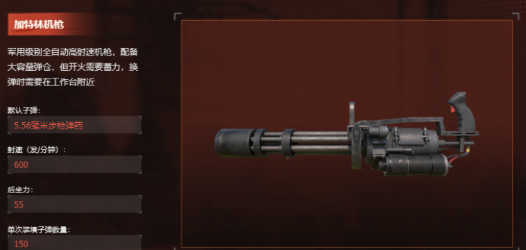 多管旋转式全自动机枪,拥有大容量弹匣与高持续输出能力,后坐力控制表现良好。但存在明显使用限制:开火前需完成蓄力准备阶段;弹药耗尽后必须返回工作台进行装填操作。该机制使其更适合固定据点防守或预设伏击场景,而非机动性要求高的动态对抗。