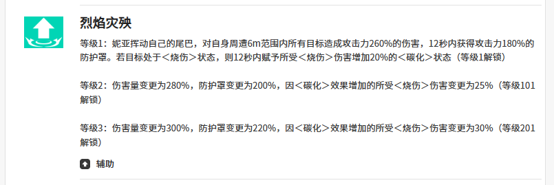 防御向技能「烈焰灾殃」作用范围为半径6米,造成260%倍率伤害,并立即生成持续12秒、数值达180%攻击力的护盾。若命中目标已附带烧伤状态,则妮亚可在12秒内对该目标额外施加碳化效果,使后续所有烧伤类伤害提升20%,大幅强化DOT链式反应。
