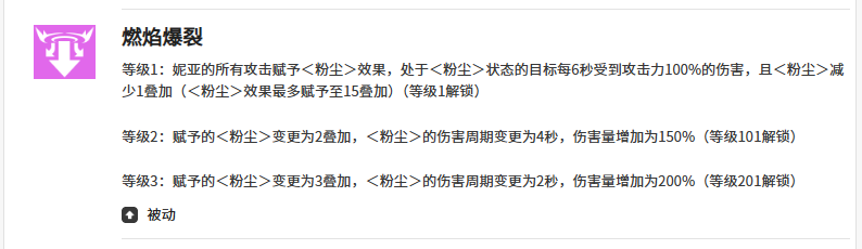 「燃焰爆裂」是妮亚构建战斗节奏的基础技能,专用于快速铺叠粉尘状态。处于粉尘影响下的敌人,每秒承受相当于妮亚100%攻击力的真实伤害;粉尘层数可叠加至4–5层,且单层消退后能迅速再叠,确保全程覆盖率。掌握该技能的释放时机,是激活全技能链式增益的前提。
