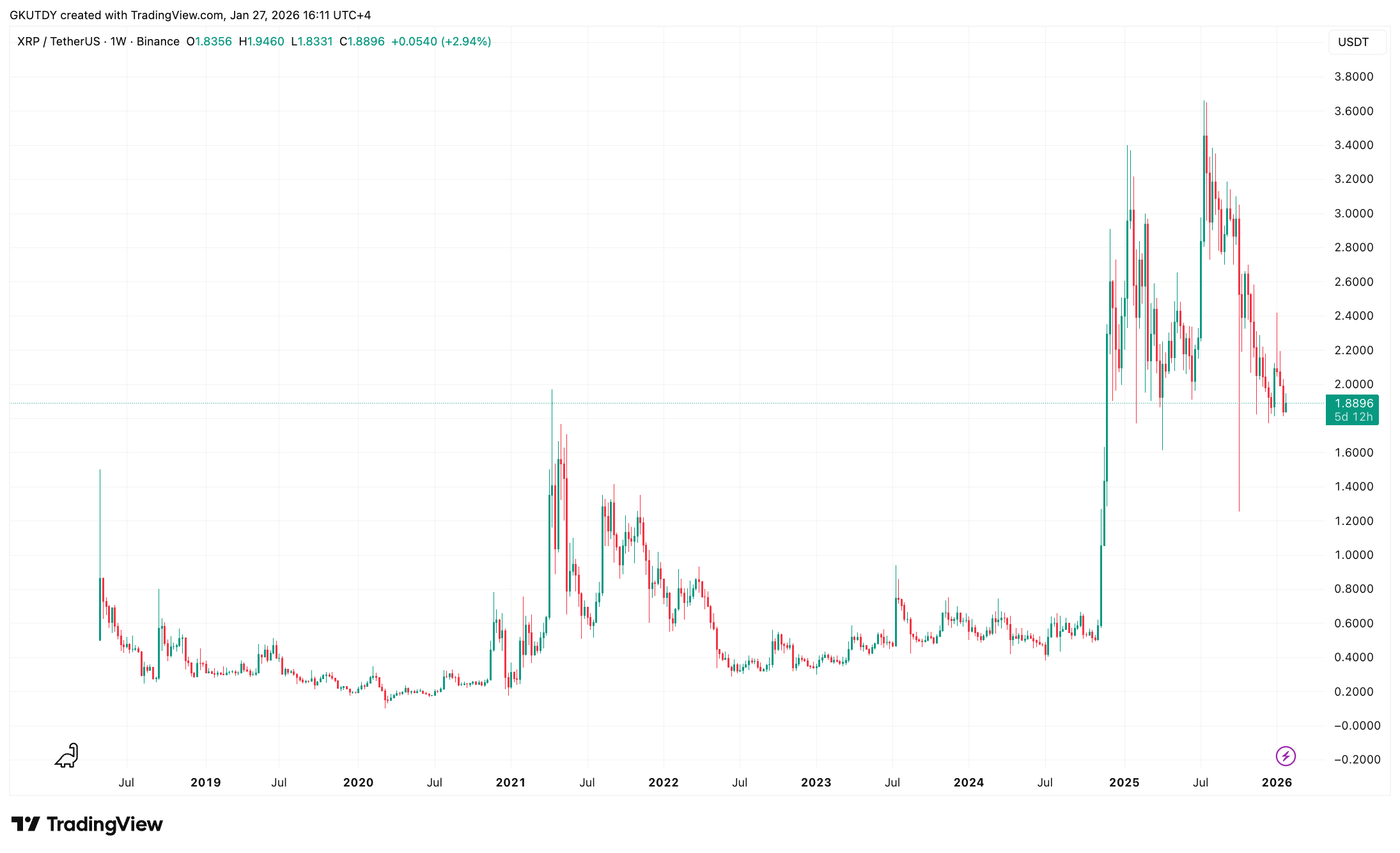 当前所有图表都显示XRP前景黯淡。自1月6日触及2.35美元后,该代币已下跌19%,现徘徊于1.90美元附近,困在自夏末形成的下降通道中。动能指标疲软,1.78美元的200日均线更如陷阱静候下方。