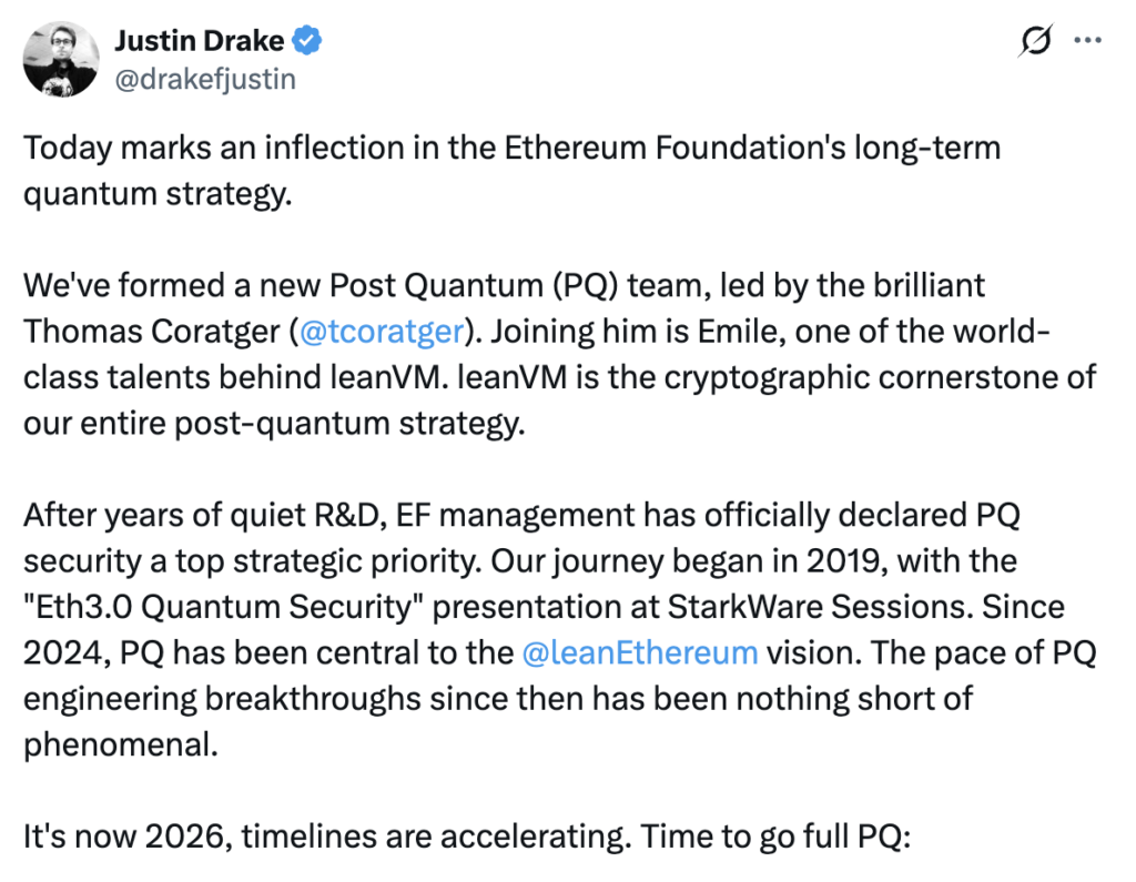 一位资深研究员直言不讳:"经过多年低调研发,管理层已正式将PQ安全列为最高战略优先级...现在已是2026年,时间线正在加速。是时候全面转向PQ了。" 这不是理论空谈。该团队由经验丰富的密码学工程师领导——包括新任后量子(PQ)部门负责人——并汇集了leanVM开发者的智慧,leanVM是为未来验证和签名设计的密码学引擎。