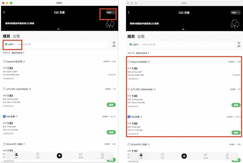 在【C2C交易】页面选定交易币种(如HKD兑USDT),根据支付方式筛选合适商家广告,点击【购买】按钮发起交易。