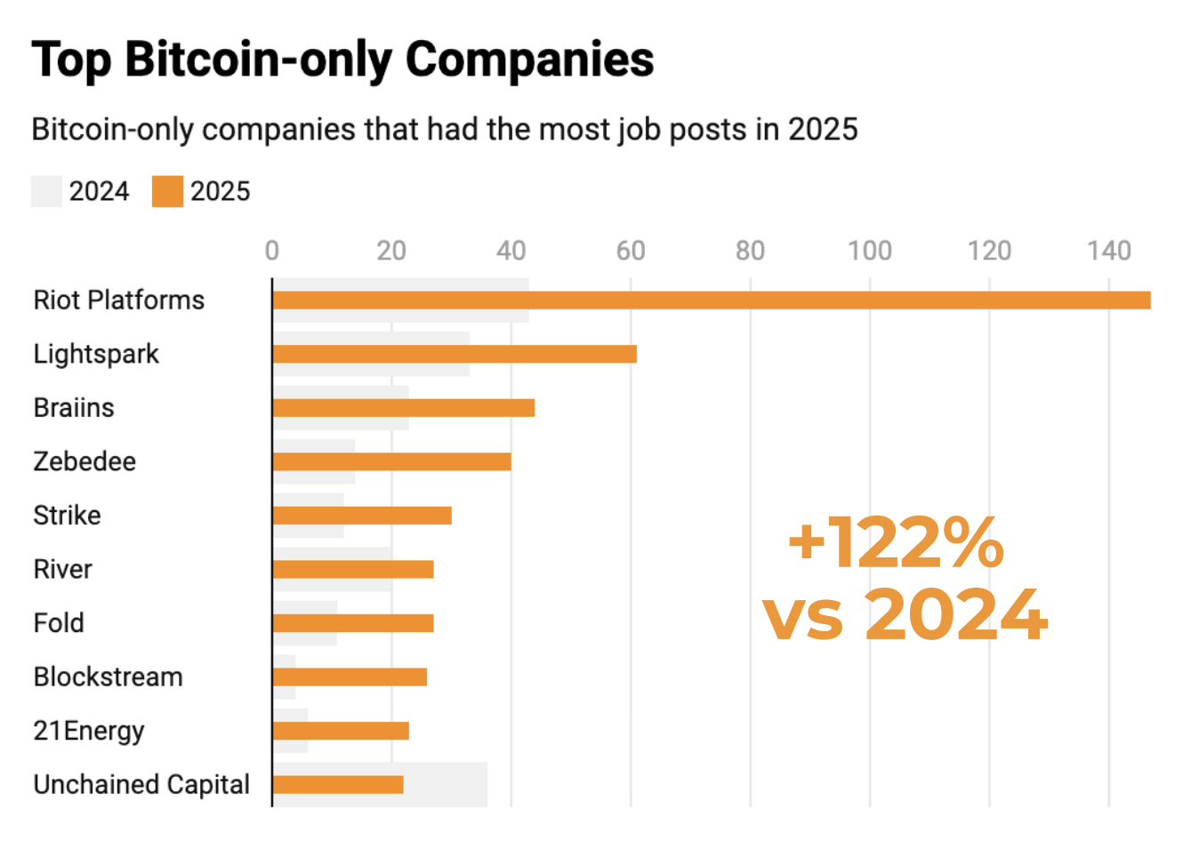 Riot Platforms虽领跑该类别但市场份额有限。纯比特币招聘量前十的企业整体实现122%的同比增长。