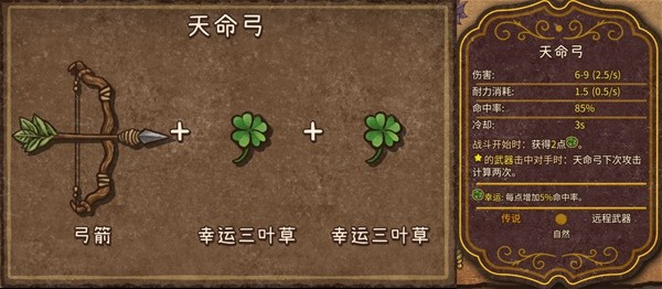 10、天命弓(传说,自然,远程武器):弓箭+幸运三叶草+幸运三叶草