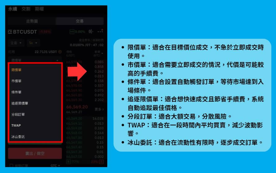 在Bybit 合约的页面上,可以选择挂单的方式,以下将针对各种挂单方式进行介绍。