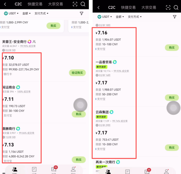 首先,我们来看一下在欧易交易所和币安交易所,一颗USDT的价格分别是多少。打开币安交易所可以看到,一颗USDT的价格是7.11U到7.12,7.13U,一直往下,以此类推。