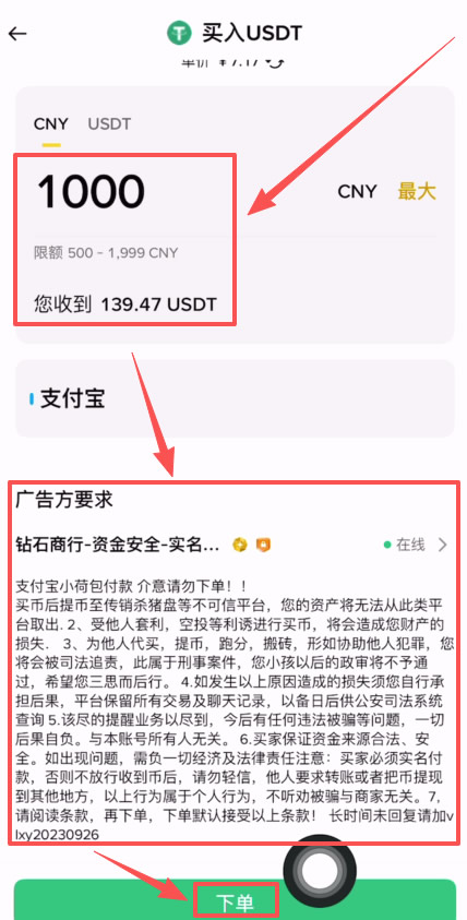 再次输入一下要购买的金额,他也会自动为我们算出来,我们支付1000r民币将收到139.47颗USDT。然后在下方阅读一下广告方的要求,再点击下方的【下单】。