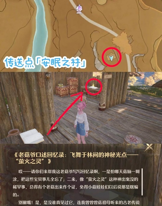 传送至「林地小屋」在正前方的树旁的小桌子上