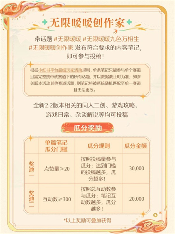 1、无限暖暖创作家:发布带有 #无限暖暖九色万相生 #无限暖暖创作家 标签的笔记,即可参与赛道瓜分及评选。