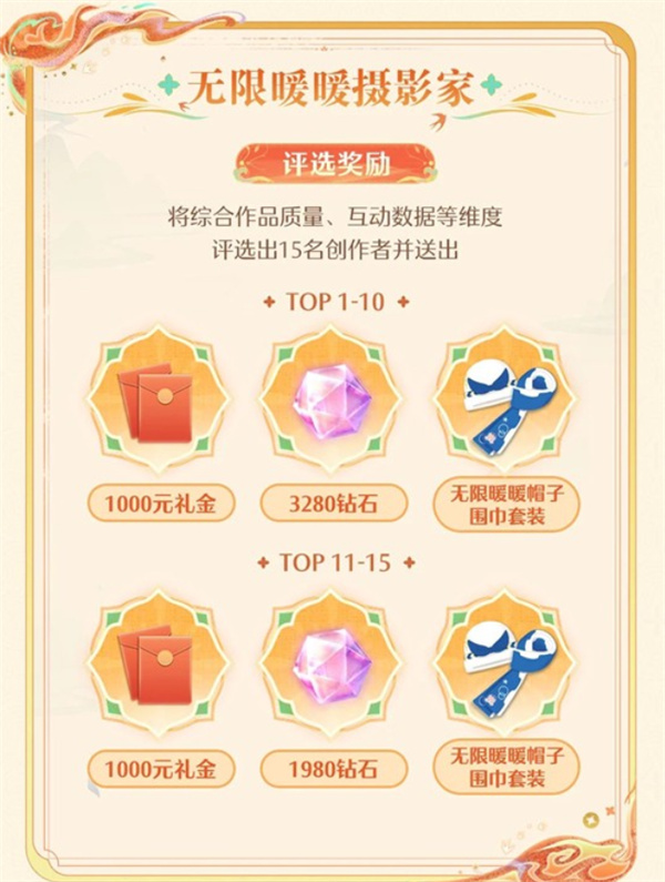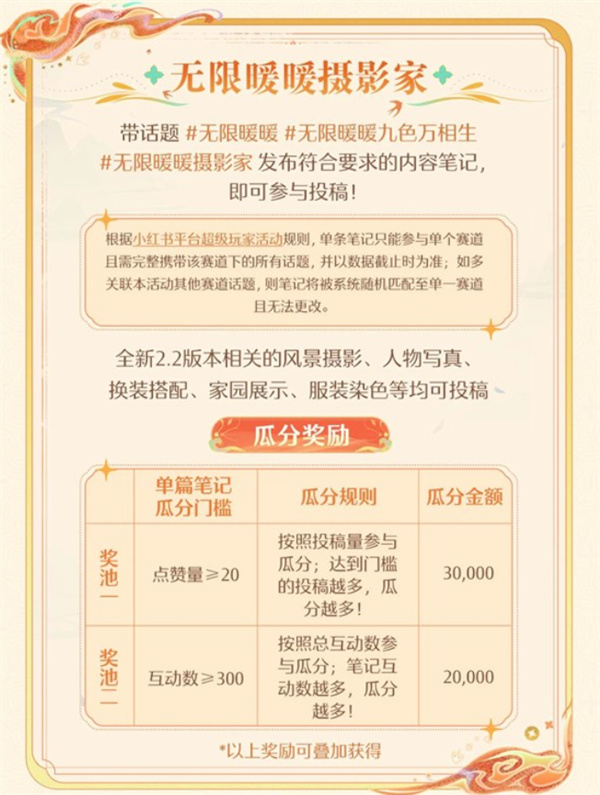 2、无限暖暖摄影家:发布带有 #无限暖暖九色万相生 #无限暖暖摄影家 标签的笔记,即可参与赛道瓜分及评选。