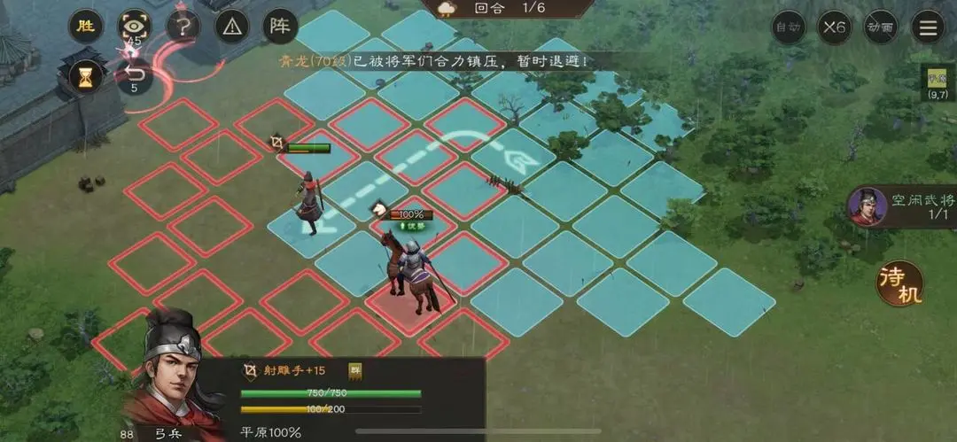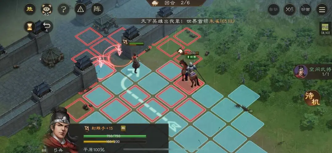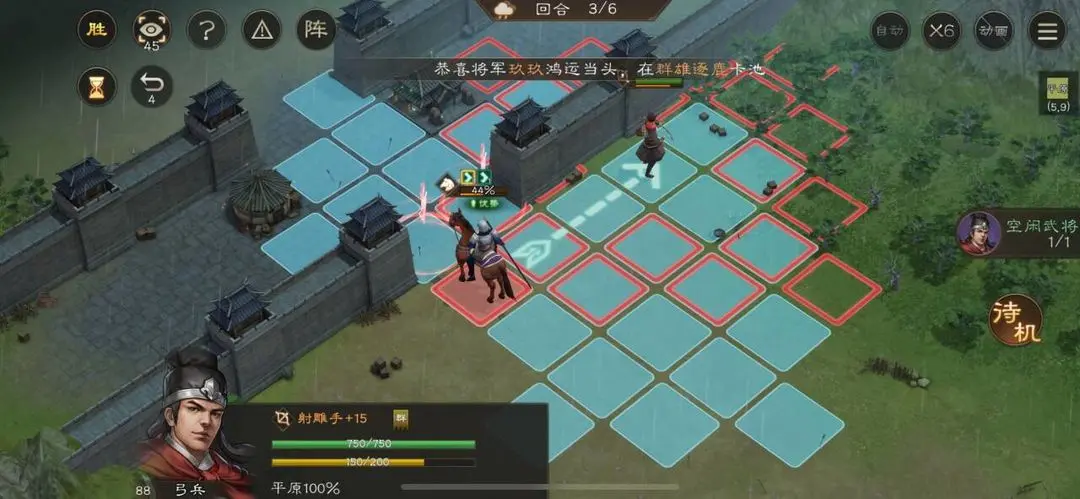 新三国志曹操传刺探军情关卡中开局不能攻击对手,否则对方会加速跑,所以需要先走位挡一下敌方。然后第二回合的时候走到城门口射敌方一箭,在第三回合的时候最后一箭就可以击败通关了。