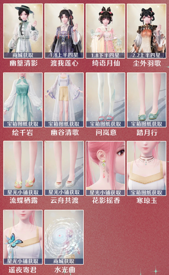 幽篁清影、渡我莲心、绮语月仙、尘外羽歌、绘千岩、幽谷清歌、问岚意、踏月行、流蝶栖露、云舟共渡、花影摇香、寒琼玉、遥夜寄君、水光曲