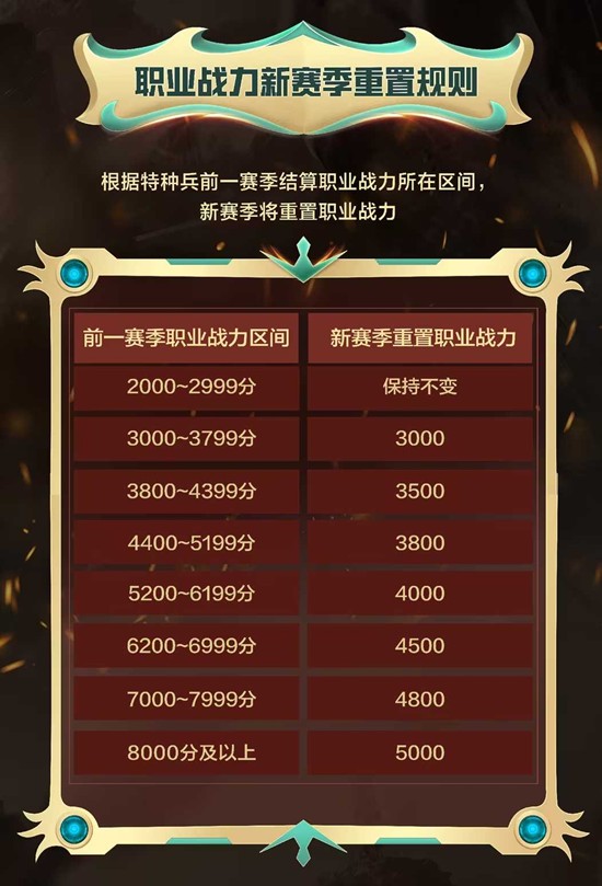 赛季结束后所有职业战力将按区间重置:2000-2999分保持不变,3000分及以上逐档下调,最高8000分以上统一降至5000分,同时9000分以上加分效率将在新赛季提升。