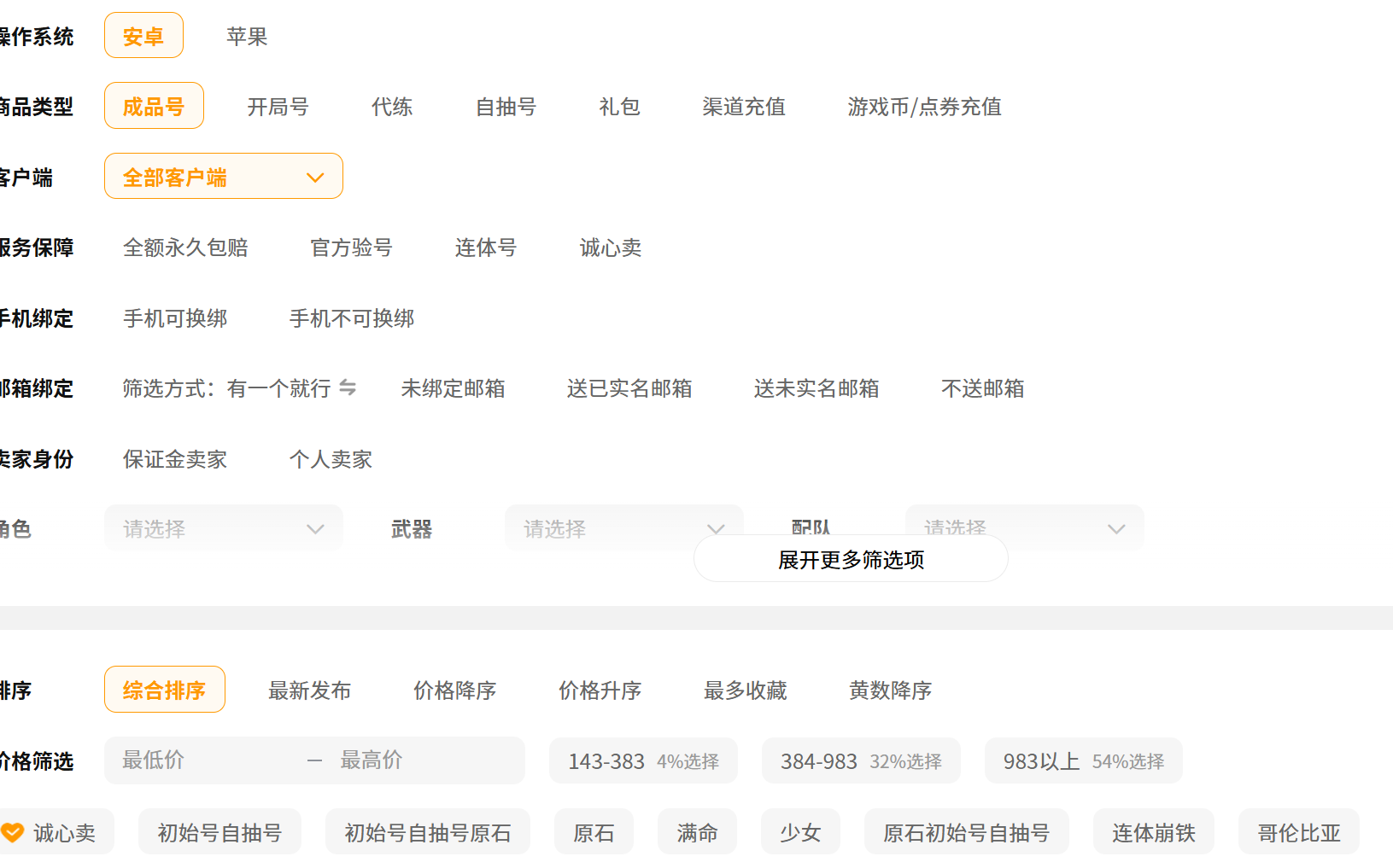 上的覆盖游戏品类很多,不止有原神游戏号,其他的游戏品类多达6000款游戏,一百多万商品在售呢,原神账号类型更是丰富多样。比如说初始号,这类账号等级较低但是价格比较低,新手福利也比较多,适合预算有限但是又渴望在游戏中拥有强力角色的新手。除此之外,还有成品号自抽号等等。能够满足不同玩家的需求。你可以根据自己想要的条件,在筛选服务中选择条件进行筛选,这样就能精准找到符合自己要求的账号了。