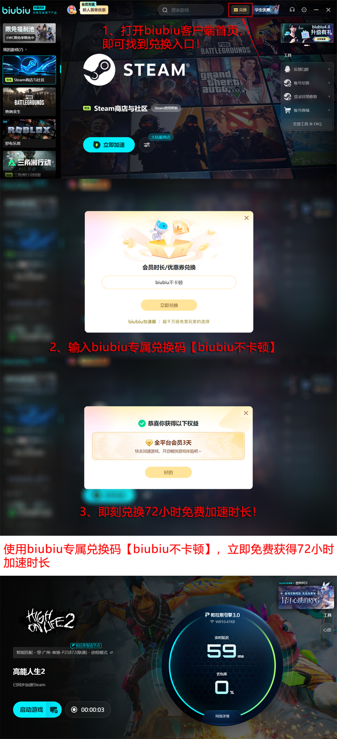 新用户注册后即可获赠24小时免费加速时长;另提供通用兑换码【biubiu不卡顿】,单账号可额外领取72小时加速权限,合计享有96小时无门槛试用周期。
