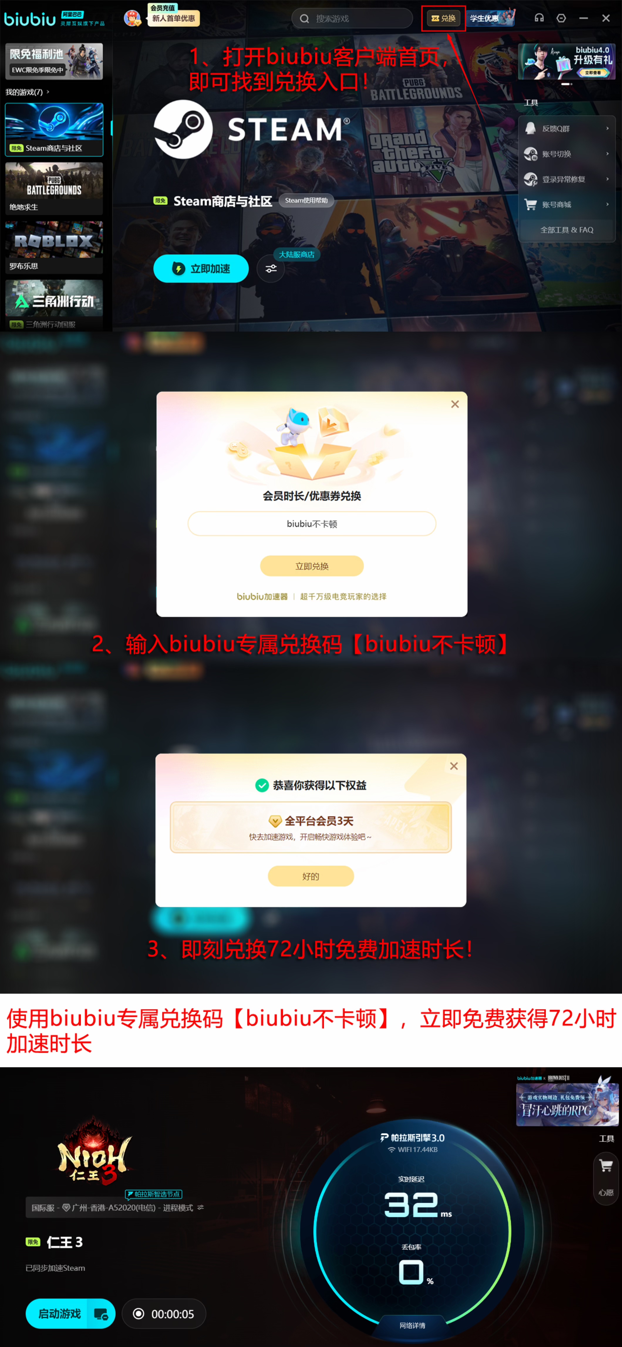 该加速器采用帕拉斯3.0引擎技术,支持按需订阅不同时长会员服务。新用户注册后可立即领取24小时免费加速时长;所有账户(含老用户)均可凭口令【biubiu不卡顿】兑换3日全节点加速权益。