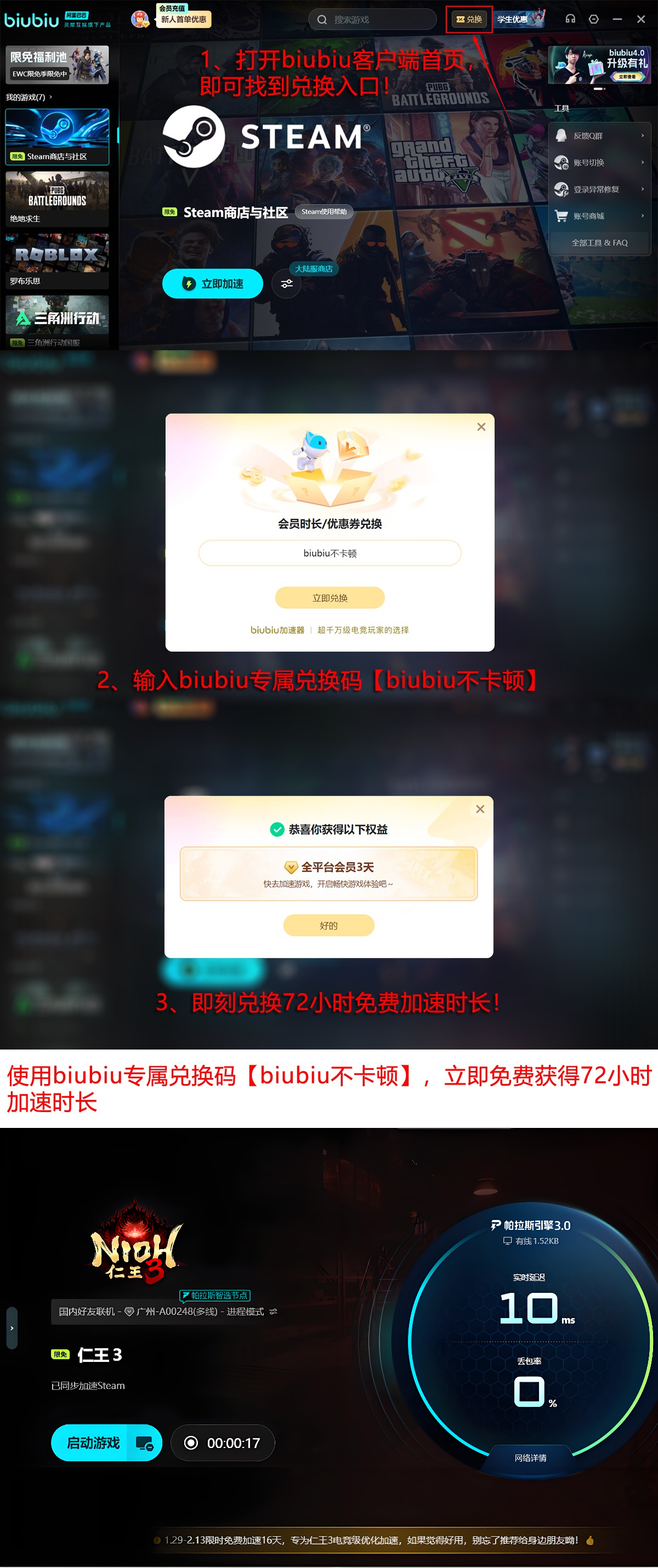 当前biubiu加速器面向全量用户开放限时福利:输入兑换码【biubiu不卡顿】,即可立即领取72小时免费加速时长;新用户完成注册后额外获赠24小时,累计达96小时,足以覆盖多轮联机刷本、Boss攻坚及跨区协作需求,全程保持低延迟、高稳定性连接表现。