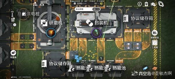 首先俯瞰模式下旋转视角,确保河在左边,左上角是种植区,包含两个种植二合一种砂叶,两个水种植二合一种芽针;在适当位置建好上下方向的仓库,在仓库左边放两个息壤一个芽针剂&息壤液,其中协议储存箱设置为仓储模式,这样就会仅生产300个息壤溶液到箱子里,需要就从箱子里拿,右边放一个低容武陵电池一个低容电池75%一个装备原件12.5%一个源石发电,不弄100%效率是为了配平息壤;然后在左边河岸建水泵把水接到水种植机 天有烘炉 反应池的液体入口,目前一个水泵供水量刚好给两个设备用,以及把砂叶放到无水种植的采种机里,芽针放到水种植的采种机里,最后根据实际情况调整发电部分。