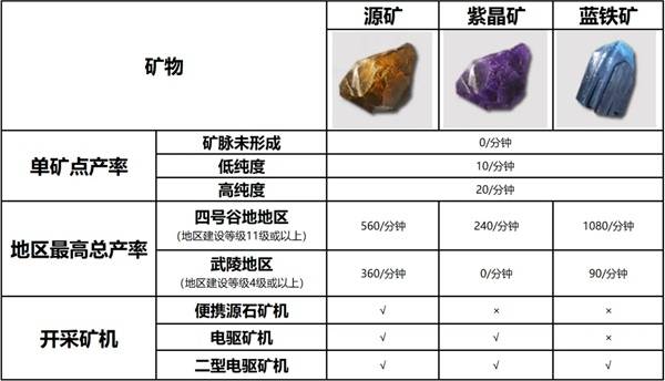 当前版本(1.0)基建中用到的矿物共有3种:源矿、紫晶矿、蓝铁矿。