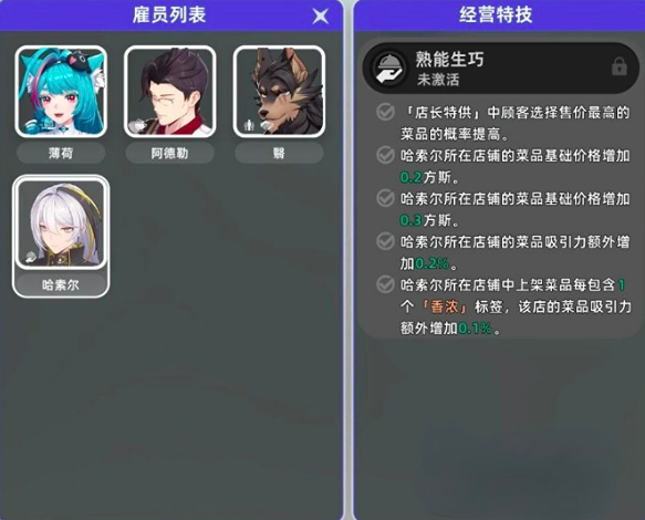 开店首步并非上架商品,而是完成基础架构搭建。进入“管理店铺”界面后,需优先开启右侧【经营特技术】模块。该系统依赖雇员协同运作,务必按推荐列表完成关键角色招募。其中,哈索尔是糖果店早期最优店长人选——建议第一时间解锁其专属技能“熟能生巧”。激活后,顾客将显著倾向选购高价高级菜品;同时,全店商品售价自动提升0.2~0.3方斯,甜品及糖果类更可额外附加“香浓”品质标签,直接拉升整体出品等级。