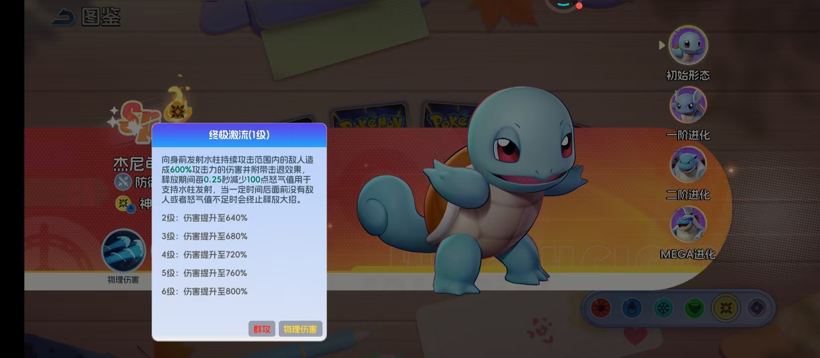终极激流是杰尼龟的主动终结技,释放后向前方喷射持续水压柱,覆盖扇形区域并强制击退命中的目标。该技能基础伤害为600%攻击力,满级提升至800%,且每0.2秒消耗100点怒气值。怒气耗尽则技能自动中断——这一设计使大招释放时机高度依赖怒气管理,强调玩家对战斗节奏的预判与资源分配能力,而非单纯堆叠冷却缩减。