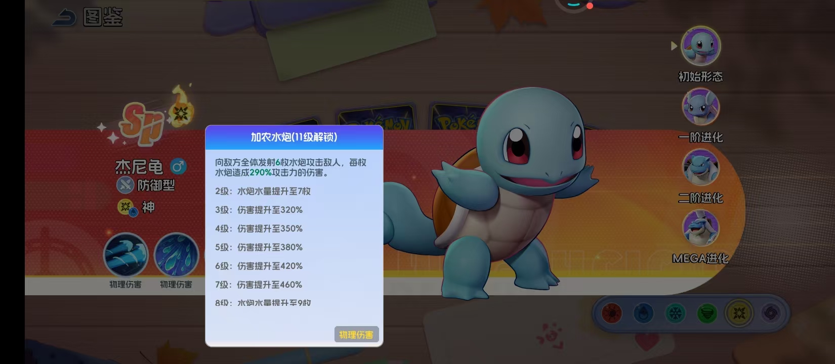 加农水炮于角色11级解锁,作为主力范围伤害技能,单发伤害达290%攻击力,6级强化后升至420%。8级时可一次性发射9枚水泡,实现全屏覆盖打击。该技能属于物理伤害类型,与杰尼龟的攻击属性完全契合,爆发集中、出手迅速,适用于清理残血单位或打断敌方关键技能施放,在团战收尾阶段具有决定性作用。