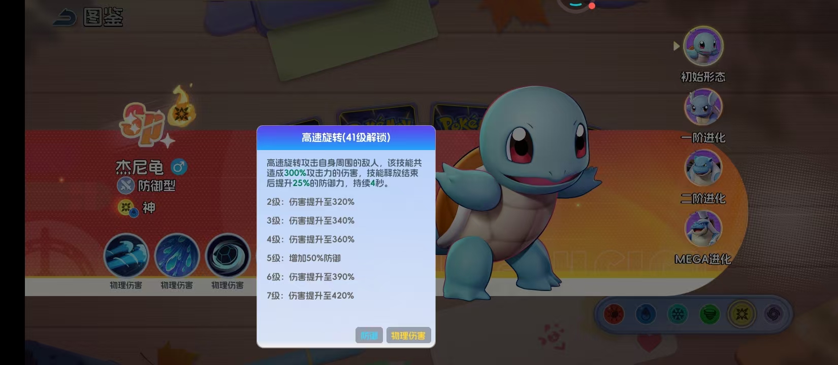 高速旋转在41级开放,是体现杰尼龟防御定位的核心技能。以自身为中心高速旋转,造成300%攻击力的范围伤害;技能结束后立即提升25%基础防御力,5级效果进一步增强至50%,持续4秒。该增益显著强化其近身缠斗能力,使其在切入敌方后排、限制敌方输出时具备更强生存资本,成为PVP环境中破阵的关键支点。