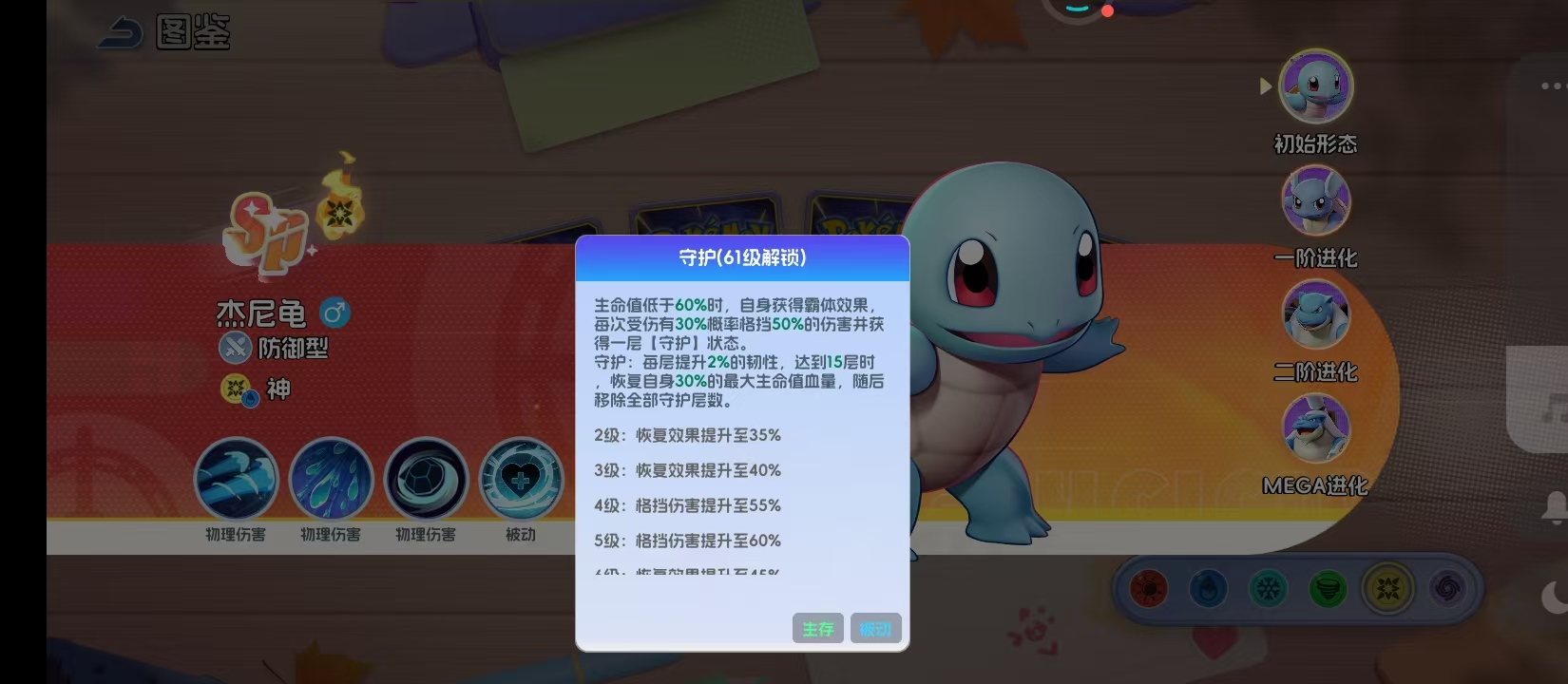 守护技能于61级解锁,触发条件为生命值低于60%。进入霸体状态后,每次受击均有30%概率格挡50%伤害,并叠加1层守护效果;每层提升2%韧性,叠满15层后额外恢复30%最大生命值。该机制赋予杰尼龟越战越强的反杀逻辑,尤其在劣势局中可通过精准拉扯完成极限翻盘,大幅提升容错率与战术纵深。