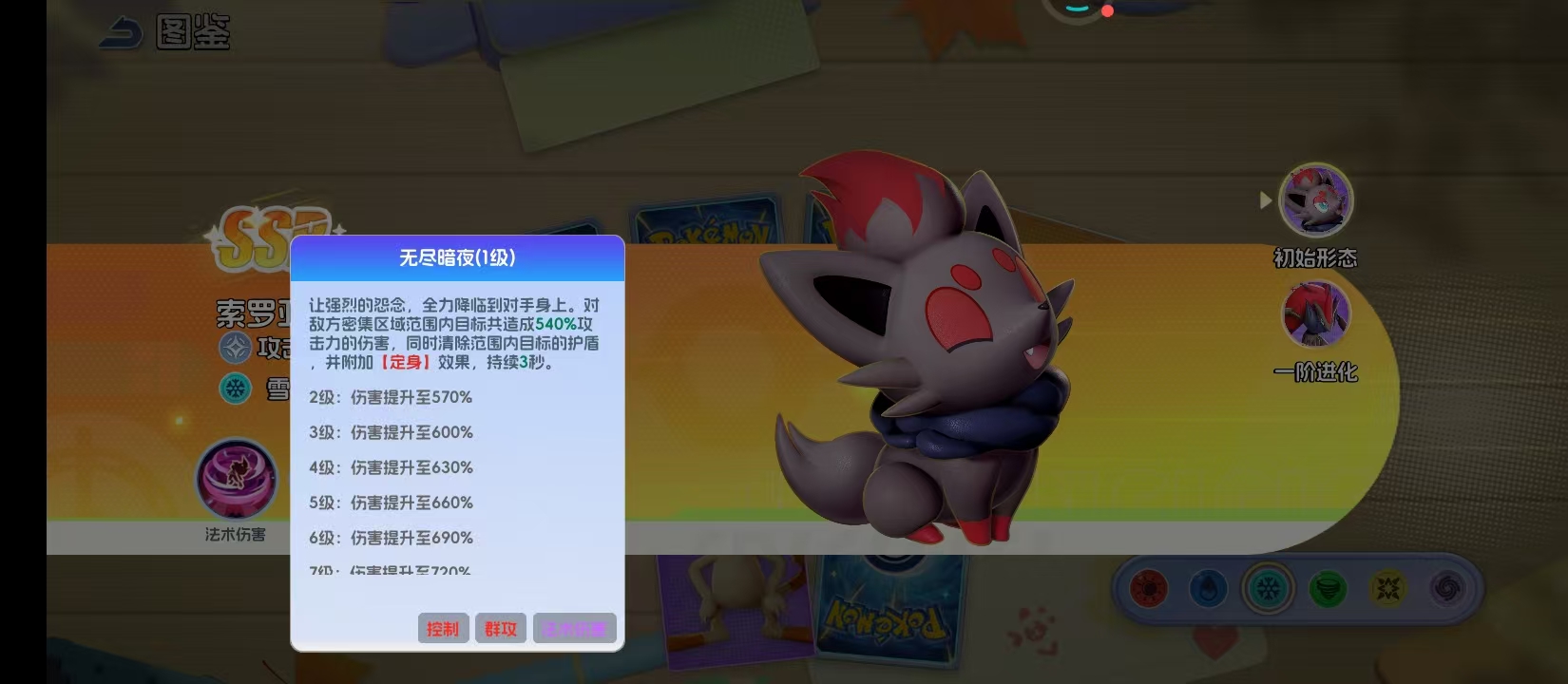 实战中,索罗亚需部署于后排位置,依赖前排或辅助队友提供控制与保护支持。推荐与具备减速能力的冰系宝可梦协同作战,以延长【无尽暗夜】的定身持续时间;若搭配护盾型队友,则能显著提升大招释放的安全性与命中率。技能升级优先级明确:首推点满【无尽暗夜】,其次为【暗影爆破】,最后补足【暗影尾】等级,确保核心压制链完整成型。