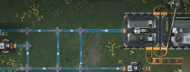 那么有什么作用?只是为了堵水管吗?实际上我最初研究这个的时候是为了省水。因为有的时候在蓝图启动时会用比较多的水,但是蓝图过一段时间有的地方就不需要用水了(比如液态息壤存满了,或是有的产线只需要一个武陵植物的粉末,粉碎机堵了),所以我就想设计一种通道,使得当一个出水口所需的水流流量下降时别的出水口流量能增加。下图即为一个基本单元: