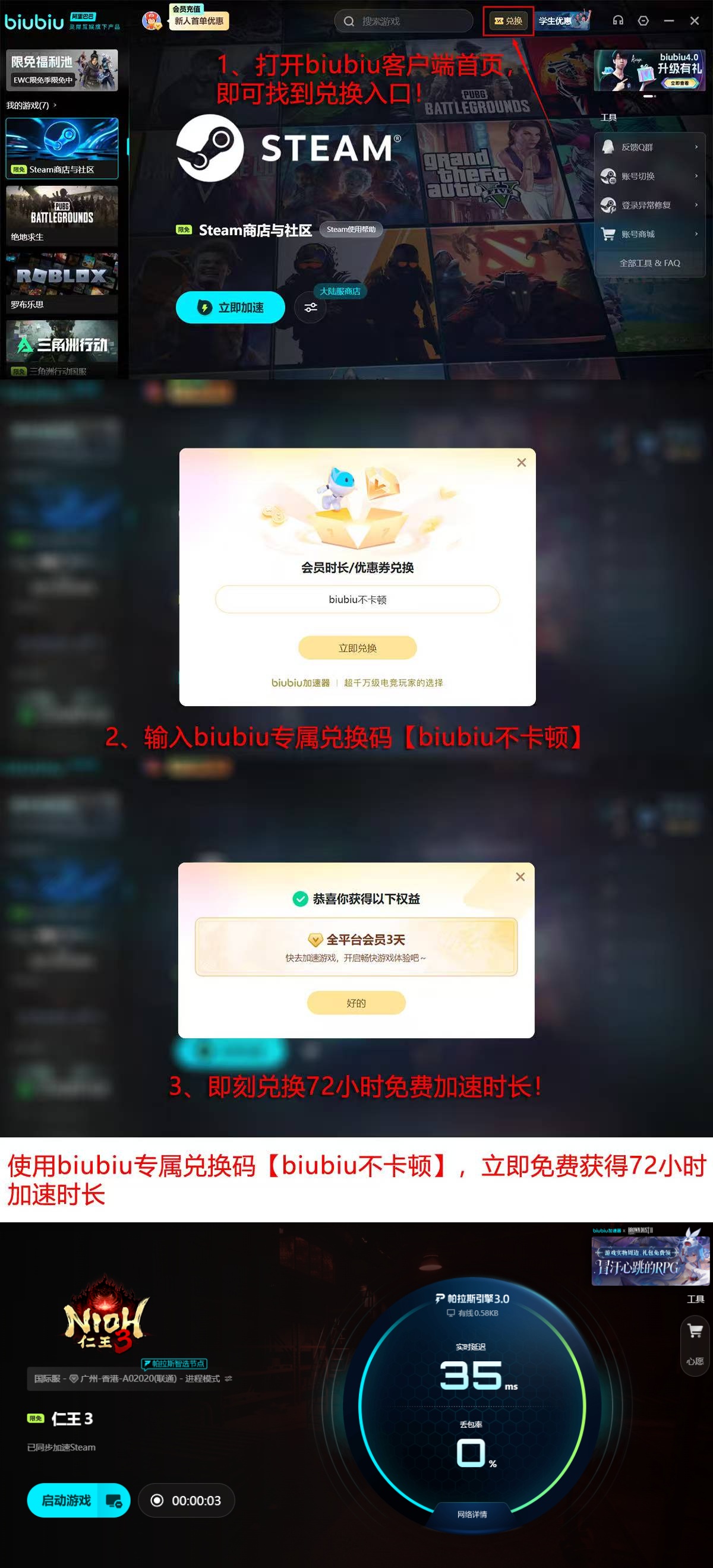 新用户注册后可直接获得24小时全游戏加速时长。另开放限时兑换通道,输入指定激活码【biubiu不卡顿】即可额外领取72小时通用加速权益。两项权益可叠加使用,新用户最高可享总计96小时连续加速服务。