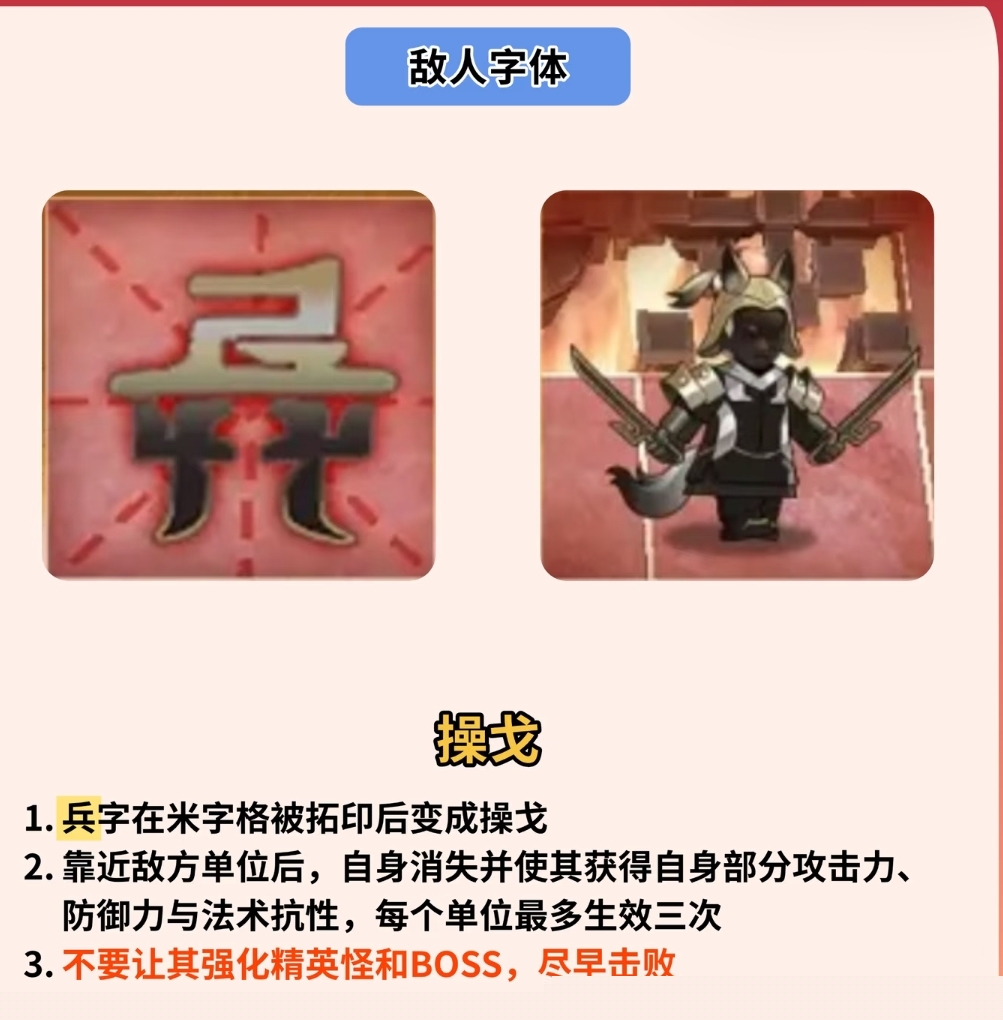 ——「兵」字被扩印后生成“操戈”,该单位受岁**人影响而生;当其贴近敌方目标时自动消失,并赋予目标部分攻击力、防御力与法术抗性,同一敌人最多叠加3次