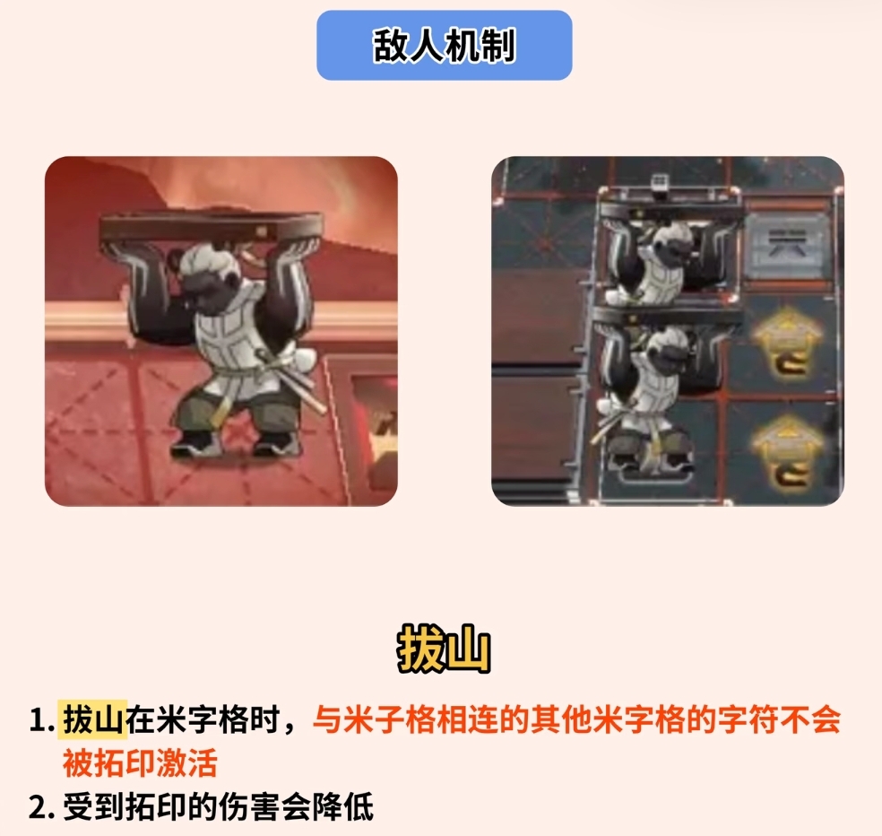 ——「山」字扩印形成山脊地形,可供高台干员部署;若该字格上存在我方或敌方单位,则直接触发扩印效果(独立冷却)