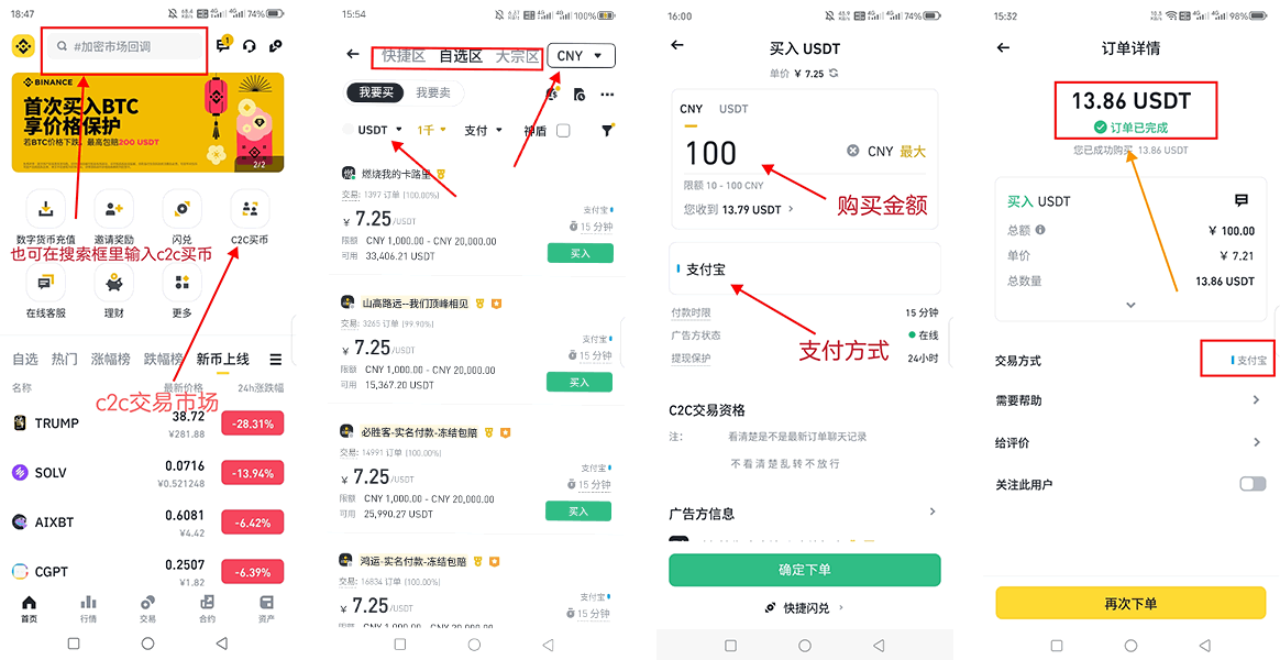 登录APP(官方注册 官方下载)后,您可以通过“一键买币”(C2C交易)用法币(如人民币)向其他用户购买USDT、BTC等主流加密货币。也可以从其他钱包向您的币安充值地址转入加密货币。