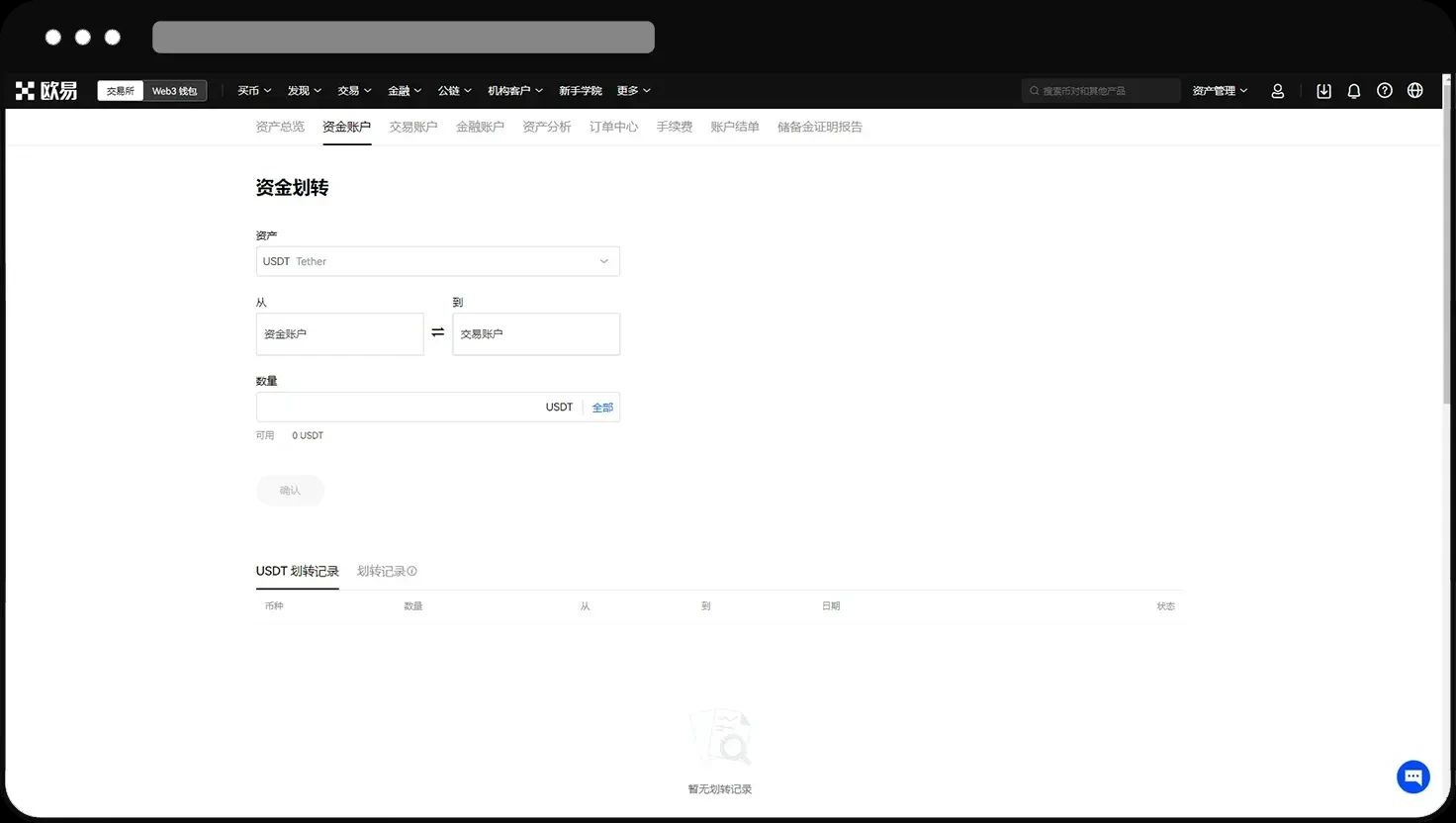 打开欧易 APP,点击【资产】—【资金划转】,选择币种以【USDT】为例 — 从【资金账户】— 到【交易账户】— 输入划转【数量】—【确定】。