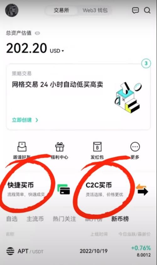 在欧易交易所如何出金入金,也就是买U跟卖U,首先我们先点击左上角的头像,进行身份认证,一定要过LV2,才能进行买U跟卖U。LV3认证过后,他的一个C2C就是买卖U的一个限额会更大一点。我们返回主界面,看到这边有两个入口,一个是快捷买币一个是c2c买币。