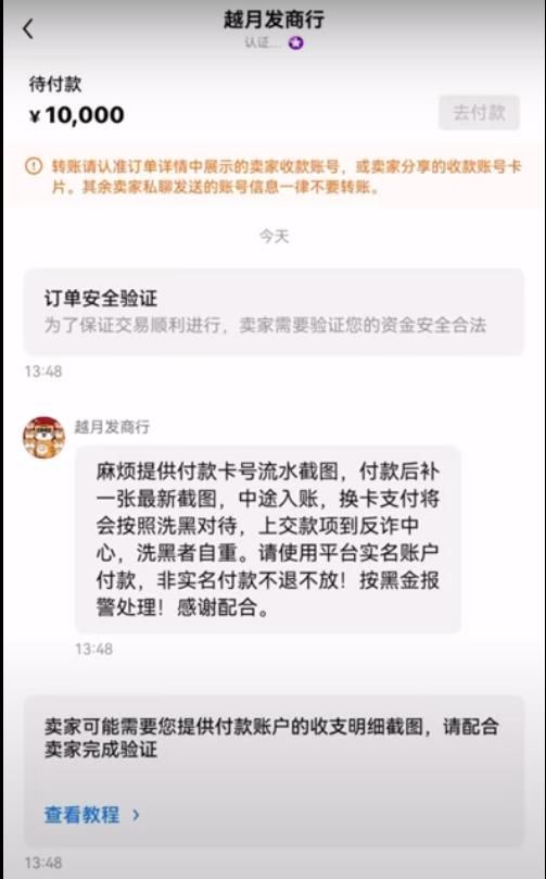 我们输入10000然后我们点击购买USDT,他会出来这个界面,然后我们点击查看商家的信息,我们看到这个商家是比较谨慎的,他要我们提供付款卡号的流水截图就是我之前说的银行卡的日常支付记录,你截图给商家转过去就可以了,他说付款后补一张最新截图就是说你把款付给他了,这张截图你也截给他,然后中途入账付款支付将会按照洗钱对待,就是比如说你不能明明是这张卡跟他进行支付的,你用别的卡给他转账,或者是你亲戚朋友给他转账,这样都是不行的,卖家看了流水截图认可之后,上面就可以点击去付款,点进去之后会出现卖家的名字银行卡号,我们给他转账之后点击通知卖家已转账,然后卖家就会把币放给我们了。