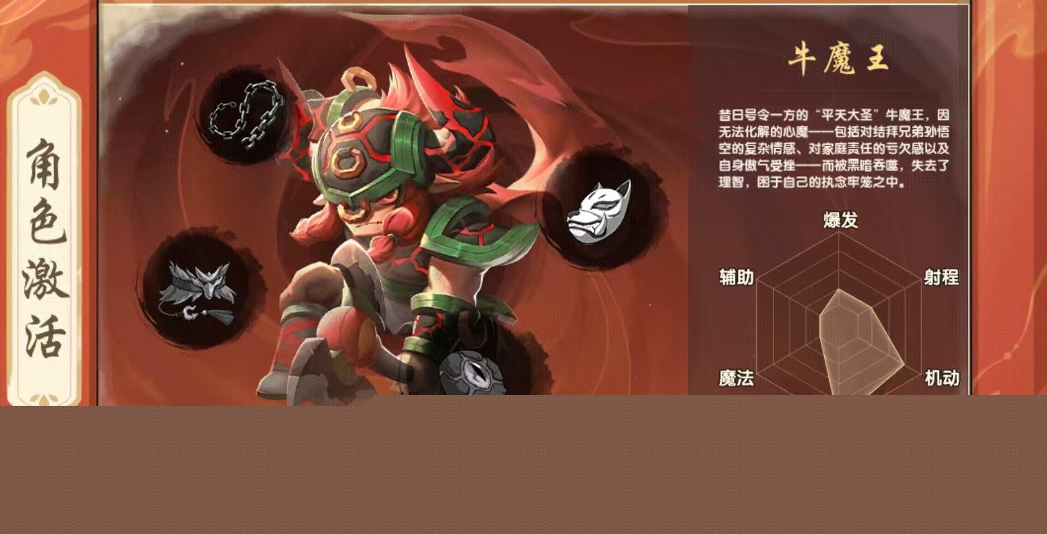 牛魔王承担前排坦克职责,以高容错率、稳定控制链与极致抗压能力见长。核心技能含魔化(大幅提升防御与减伤)、摄魂魔爪(强控+吸血)、螺旋横扫(大范围击退)及蛮牛冲撞(直线突进并眩晕)。被动技能“疯狂蛮力”可显著提升物理强度与承伤转化效率。该角色适用于习惯正面接敌、主导团战节奏、专注保护队友或持续施压的玩家群体。