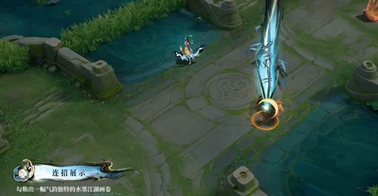 法阵铺展,水墨竹林在四周生长掩映。中央潭水浮现上古女史画像,圆月从水面缓缓升起,渐化为骄阳,日月同辉笼罩全场。法阵边缘浪花翻涌,水墨粒子随箭矢激荡,晕染出一卷独属于伽罗的江湖气韵。