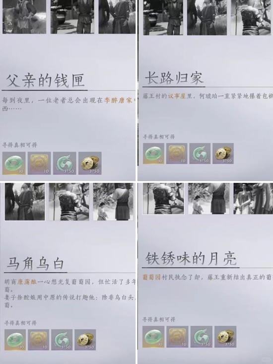 建议按顺序做这四个任务,你会慢慢发现剧情里的人物都是相互关联的。整体来说,这个过程其实就是帮藤王村筹备葡萄祭典——白天(午时)和村里的活人npc互动推进事务,到了夜里(子时)则会遇见已经逝去的角色,继续完成任务线。