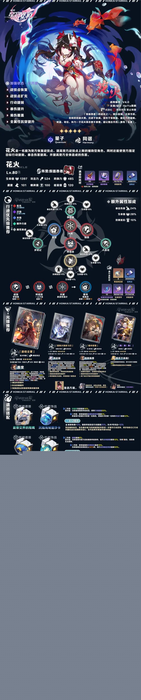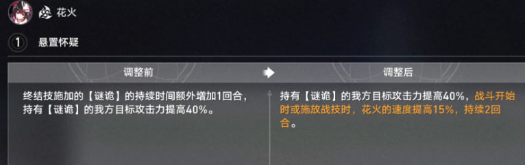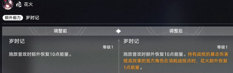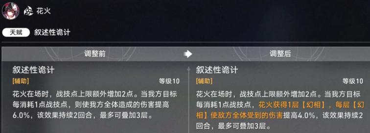 ●由于战技回合改动,行迹2也完全调整,我方角色单次回合消耗≥3战技点时,则花火的下次战技为0消耗,完美契合耗点类主C;