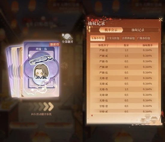 3-3、实体吉祥珍品包内容:每包可开出 5 张贴纸,五位男主贴纸获得机率各为20%。