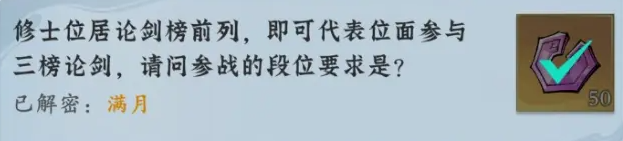 7、修士位居论剑榜前列,即可代表位面参与三榜论剑,请问参战的段位要求是?满月