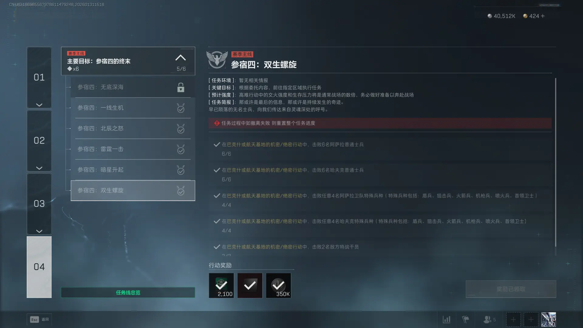 5、在巴克什或航天基地的机密/绝密行动中,击败2名敌方持战干员。
