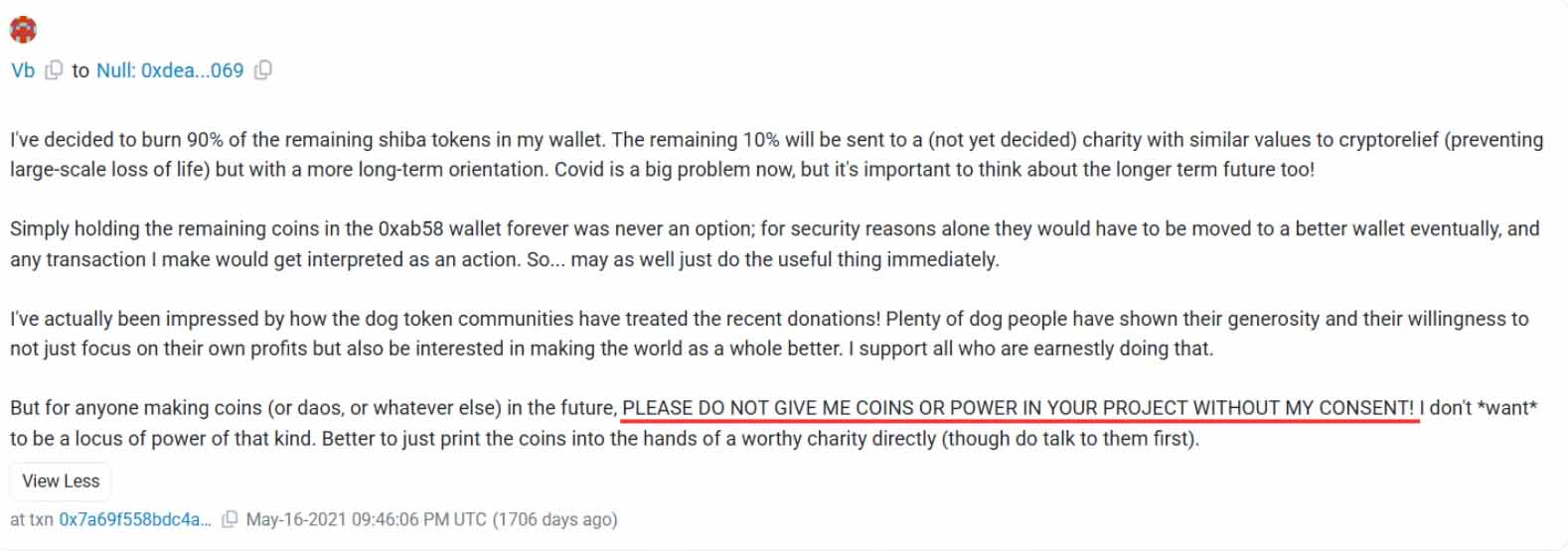 Vitalik 也曾公开表示,希望未来项目开发者不要在未经他同意的情况下,将代币直接转入他的钱包,并呼吁不要将个人钱包地址作为行销工具使用。