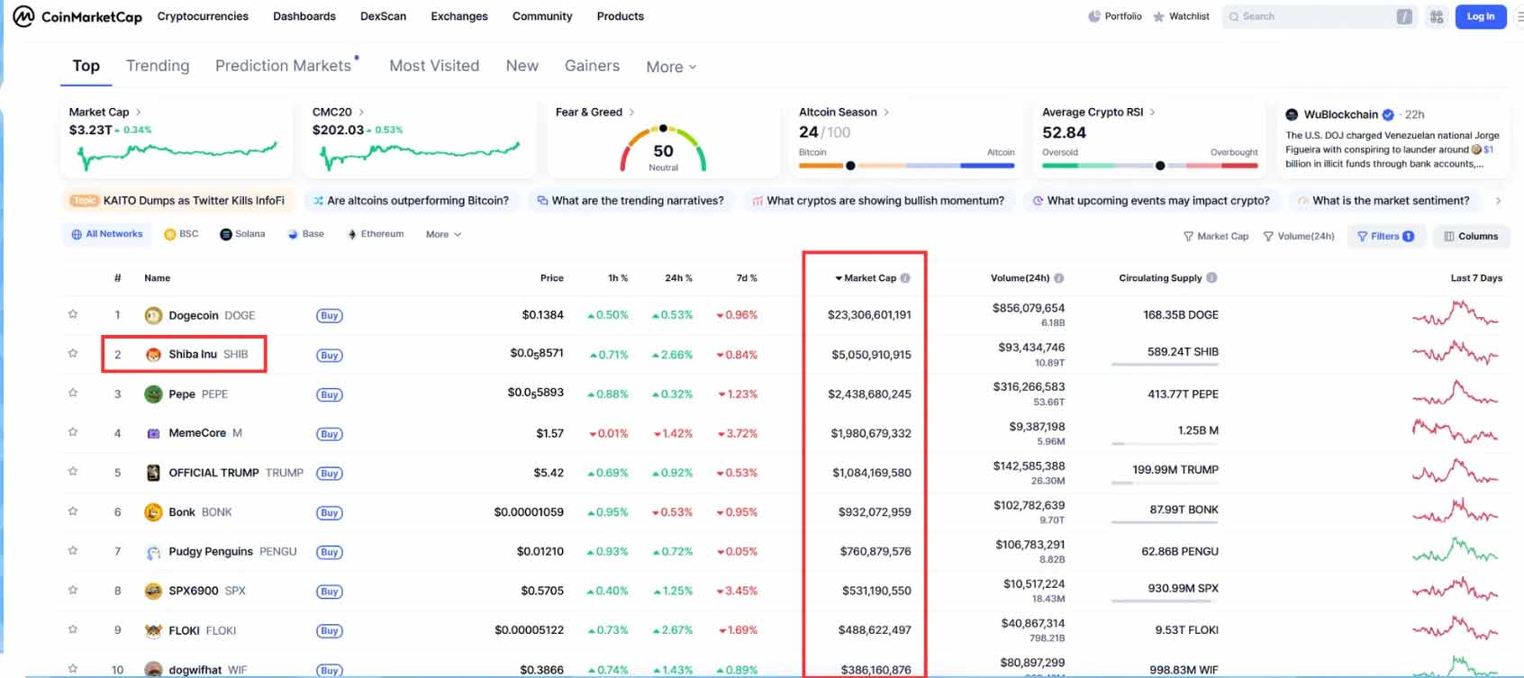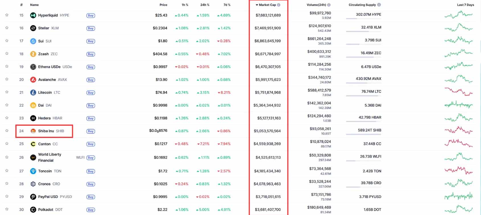 截至 2026 年初,柴犬币的市值约 50.1 亿美元,在全球加密货币中位居前 20~25 名,属于大市值币种。